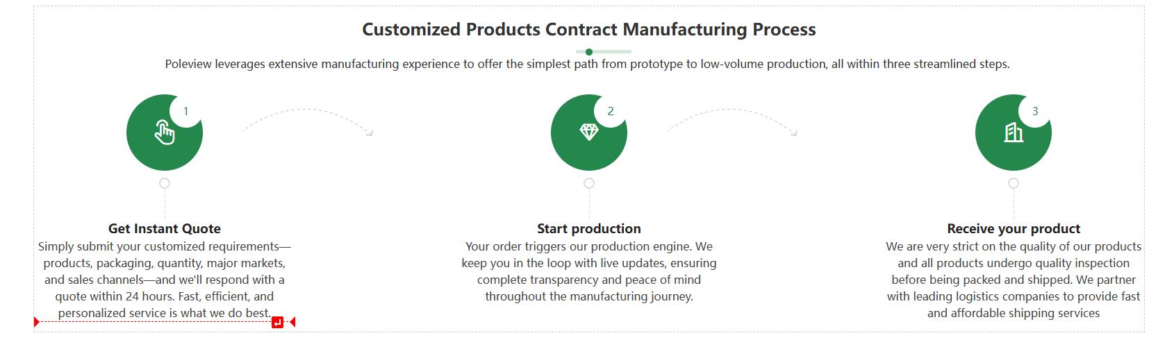 <p style="text-align:center">Poleview leverages extensive manufacturing experience to offer the simplest path from prototype to low-volume production, all within three streamlined steps. </p>