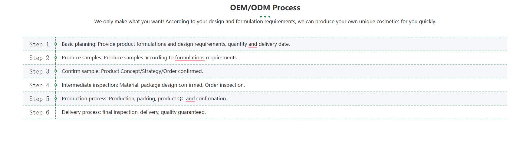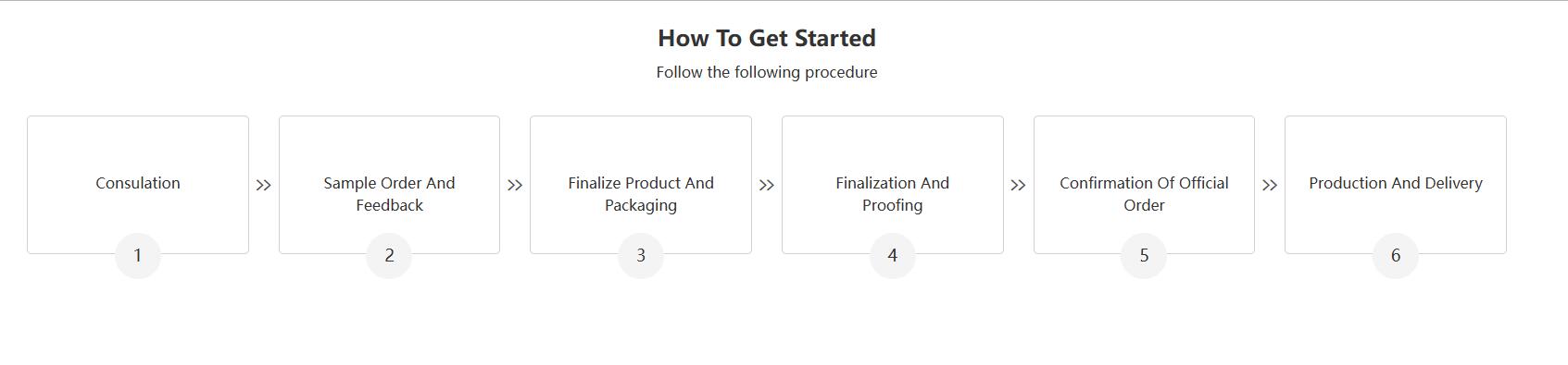 <p>Choose The Service → Stock/Product Samples → Packaging Design → Production → Shipping After QC</p>