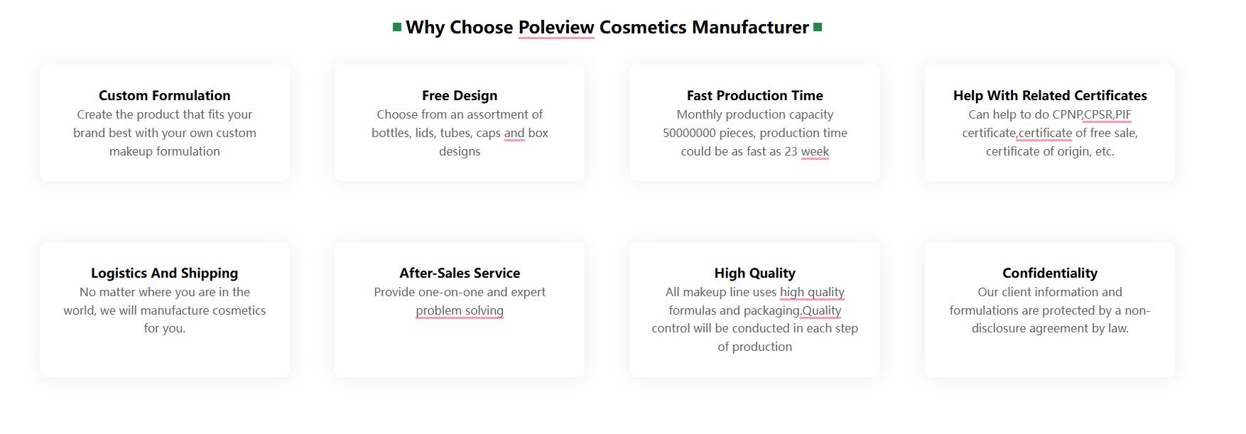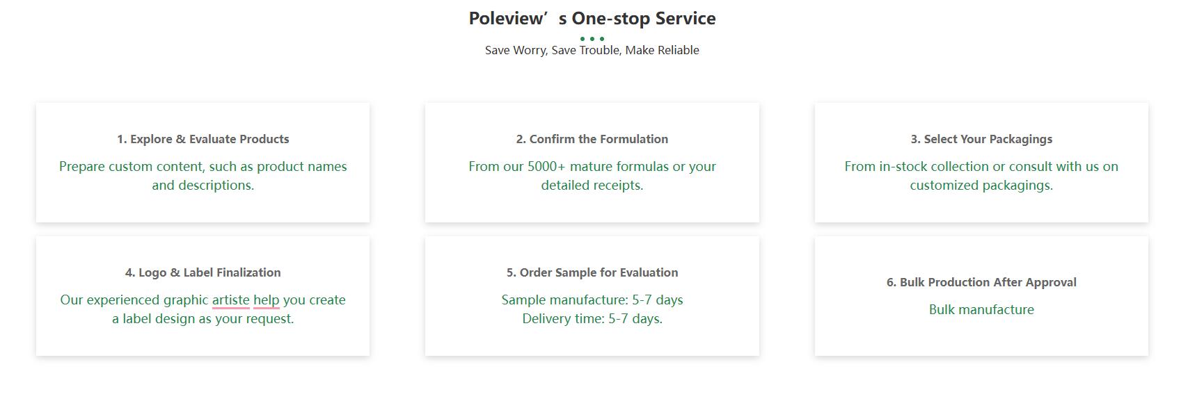<p><strong>Poleview </strong>provides content samples and package samples at within a short time. We can provide formulations based on our own portfolio or samples.</p>