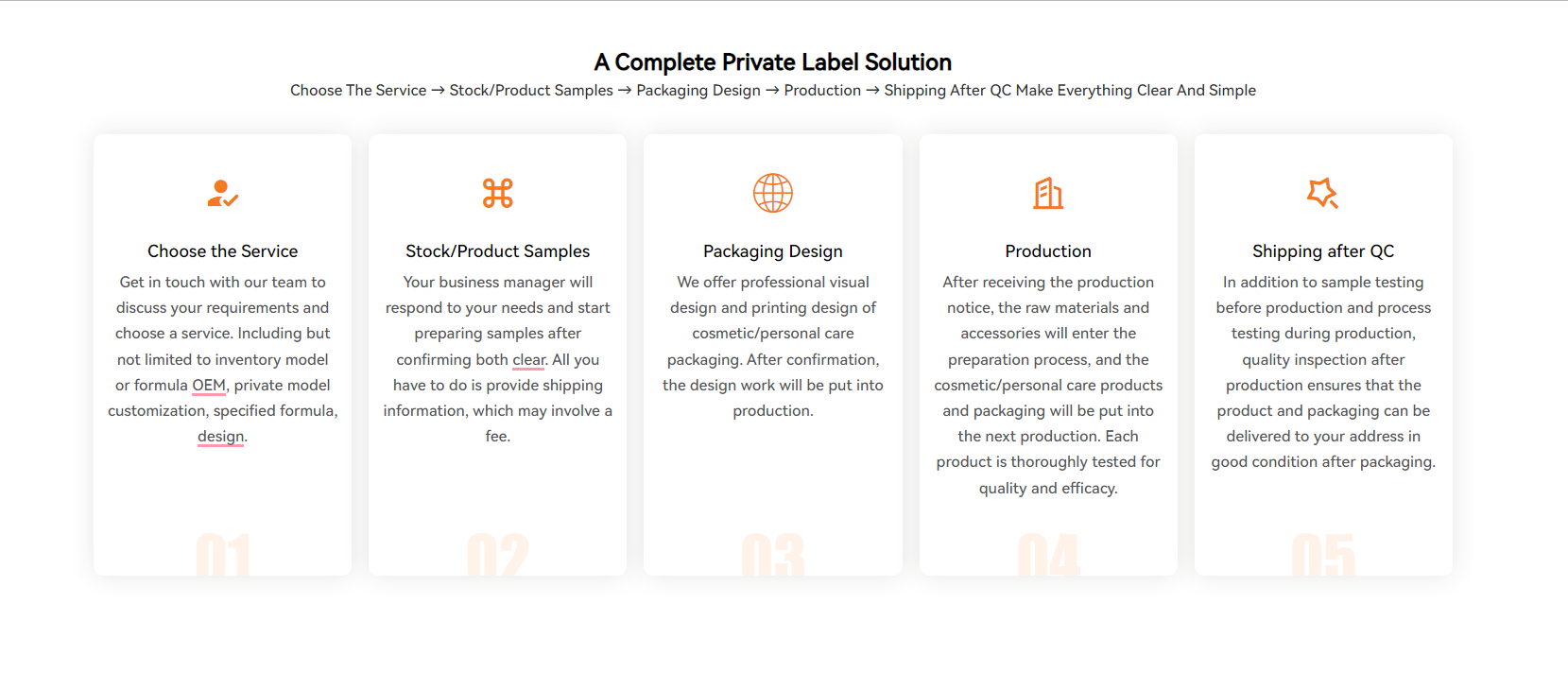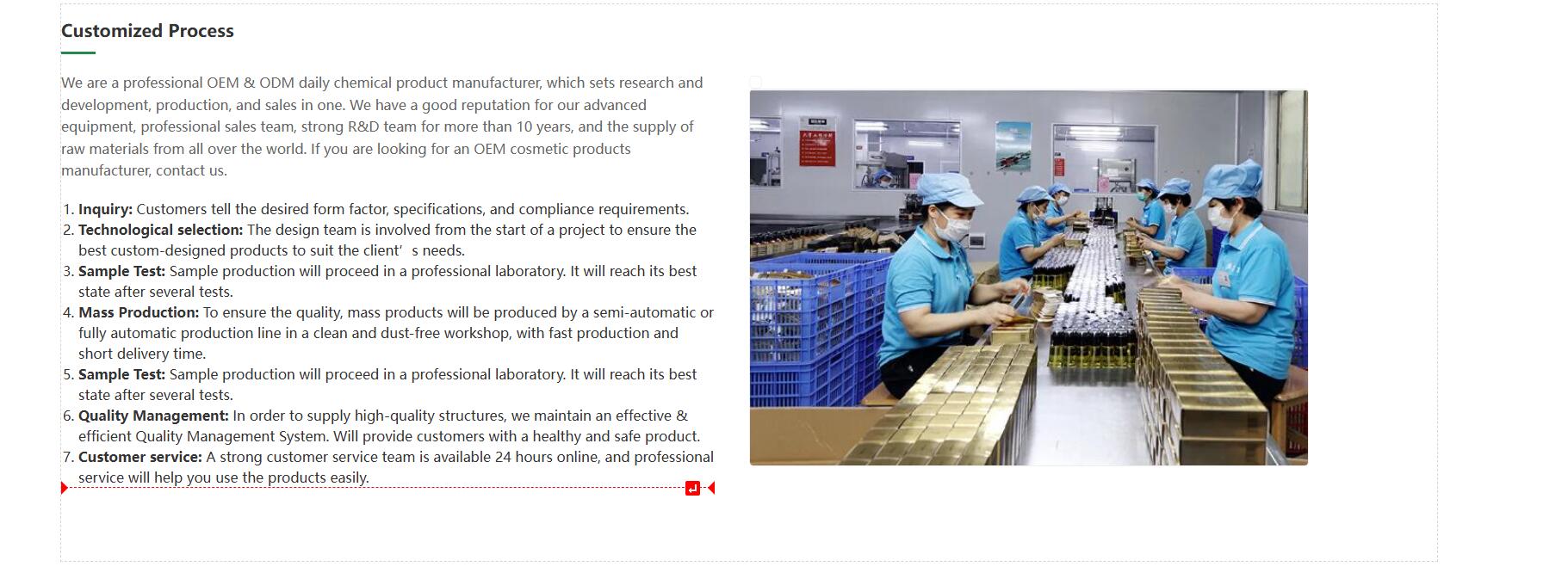 <p>After receiving the production notice, the raw materials and accessories will enter the preparation process, and the cosmetic/personal care products and packaging will be put into the next production. Each product is thoroughly tested for quality and efficacy.</p>