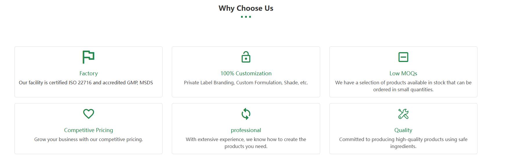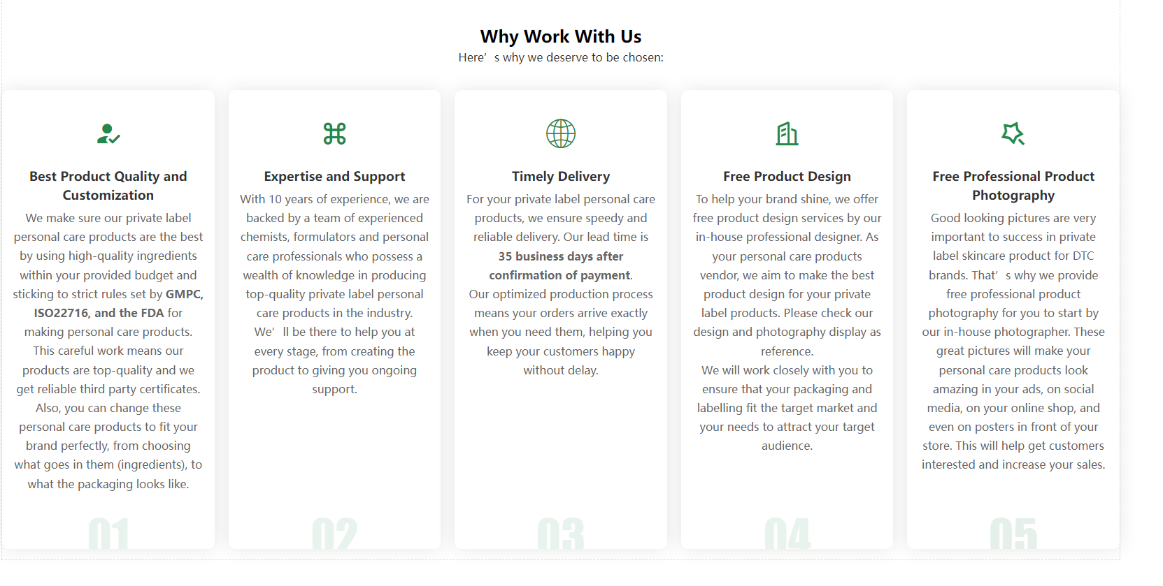 <p>This careful work means our products are top-quality and we get reliable third party certificates. Also, you can change these personal care products to fit your brand perfectly, from choosing what goes in them (ingredients), to what the packaging looks like.</p>